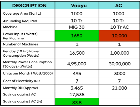 Vaayu Hybrid drastically cuts down on energy-intensive refrigerant-based cooling by efficiently using water evaporation to cool under the right circumstances. This results in reduced energy usage and operational expenses.